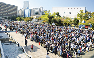 連休中、特に大きな盛り上がりを見せたのが12日に行われた原子力空母「ロナルド・レーガン」の一般開放。普段立ち入ることのできない空母に乗船できる機会とあって、県外からの観光客や艦船マニア、さらには祝日ということもあり、家族連れなどが長蛇の列を作った。