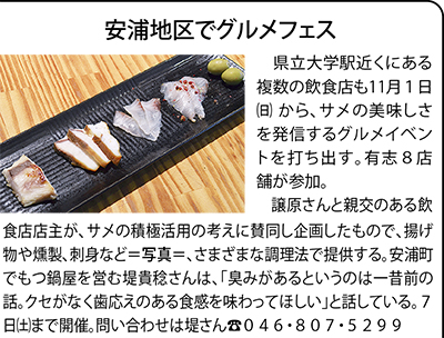 新安浦港で一年中獲れるにもかかわらず市場に出回らないサメを積極活用しようとする動きが広がっている。東部漁協横須賀支所の漁師による加工品の販売計画や、来月1日から始まる安浦地区の有志飲食店によるグルメイベントなど、今まで厄介者とされてきた「未利用魚」に注目が集まりそうだ。