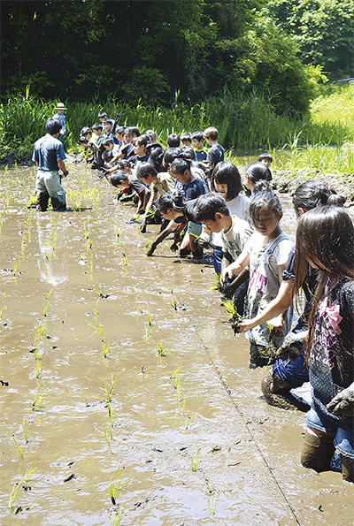 長井小学校の5年生の児童61人が学校近くの谷戸田で田植えに挑戦した。ひざ上まで泥につかりながら横一列に並んで丁寧に苗を植えていった。児童らは総合学習の時間を活用して「米づくり」を学んでおり、田んぼをフィールドに刈り取りまでの一連の作業を行う。