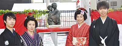 像の設置は同校の生徒らが地域の賑わい創出、手紙文化の振興を目的として昨年末から進めてきたプロジェクト。ブロンズなどの資金に関して、8月からインターネット上で資金を募るクラウドファウンディングを実施して目標の200万円を達成。除幕式を開くに至った。