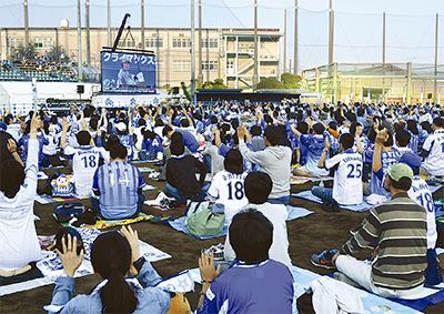 長浦町にある横浜DeNAベイスターズ2軍の練習場が内野から外野まで人で埋め尽くされた。球団関係者も「見たことない光景」と話す。その数約4000。今月15日、広島で行われたプロ野球クライマックスシリーズを戦うベイスターズをパブリックビューイングで応援しようと球団が主催した。同チームとして初めて一般開放を行い、280インチの特大画面をホームベース付近に特設。市内外から多くのファンが駆け付けて声援を送った。