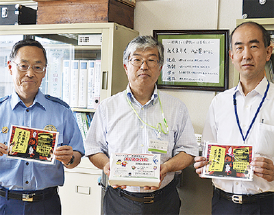 田浦警察署では、振り込め詐欺の被害を未然に防ごうと啓発チラシを作成し、中高生から高齢者へ注意喚起する「孫の手作戦」を始めた。同管区での今年に入ってからの被害額は、10件約2000万円と「危機的状況」だという。田浦・追浜・鷹取中と追浜高校にチラシ(約2000枚)を配布=写真=、祖父母や近所の高齢者への声掛けを促した。