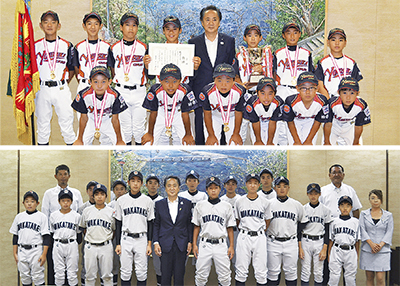市内の少年野球チームの活躍が目覚ましい。横須賀中央リトルリーグ=写真上、若竹ライナーズ=写真下、横須賀ヤングビックナインの3チームが今夏に開かれる全国大会への出場を決めた。硬式・軟式、所属リーグの違いはあるが、いずれも快挙といえる出来事。横須賀中央、若竹の両チームは市長室を訪れ、「選手一丸で勝利を掴む」(横須賀中央/小山大和さん)「初出場となるが全国に名前を刻んでくる」(若竹/岡本清道さん)と上地克明市長に全国での健闘を誓った。