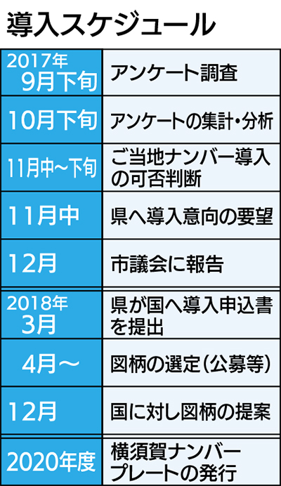 一方で導入には、地域住民の合意形成が条件となっている。仮に「横須賀ナンバー」が導入された場合、新車購入時に旧ナンバーを選ぶことができなくなる。そのため、市は市民と市内事業者に対して賛否を確認するアンケートを実施する考え。結果に基づく判断は自治体に任せられており、2千人に聞き取りを行い11月中旬に方針を決定する。