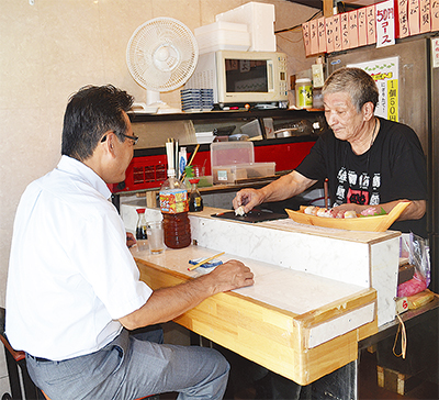 板前を務めるのは穐本洋紀さん(70)。もともとこの場所で居酒屋「くるくる」を営んでおり、今回は店の外側を一部改修してにぎり寿司のカウンターにした。店名の由来は40年以上前に穐本さんが衣笠商店街仲通りで営業していた回転寿司店からの名残り。近年は居酒屋経営が主だったが、”寿司職人”として多くの人に握りたてを味わってほしい、外でよりお客さんと近い距離で接客したいなどの理由で、オープンさせた。