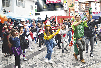 ボランティア団体「グリーン・バード」主催のハロウィーン企画。ETCダンススクールの生徒やその場で見ていた人たちが参加し、見物客を沸かせた。参加した田戸小1年の加賀沢由衣さんは「人が多く緊張したが、楽しく踊ることができた」と話した。
