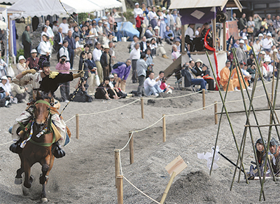 笠懸は、三浦一族のお家芸として永く伝えられてきたもの。平安末期から室町時代に流行した流鏑馬(やぶさめ)、犬追物(いぬおうもの)と並ぶ三大古弓馬術のひとつ。全速力で走る馬上から矢を射るもので、流鏑馬(やぶさめ)よりも実戦的といわれている。いにしえを感じさせる衣装を身に纏った射手が、全速力で走る馬上から矢を射る姿はまさに圧巻。