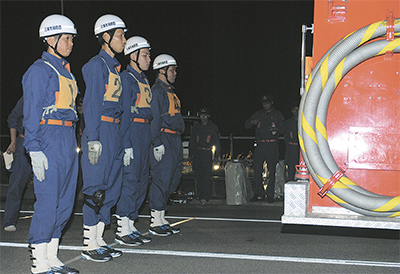 訓練後半、杉山副市長らが見守る中、本番同様の消防操法が披露された。一瞬の静寂と同時に場の空気は一転、緊張感に包まれた。やや強張った団員の表情からも真剣さが伝わってくる。演技スタート。消防車から放水の的までを団員は消火ホースを繋いでいく。「1秒でも早く」―団員の思いがキレのある動きから伝わってくる。速さと正確な動き、放水の姿勢などひとつでも狂えば減点に繋がる。練習とはいえ最後まで緊張感を持って臨んでいた。