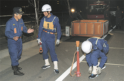 「素早くそして正確に。手と足の位置はここ。次の動作に移るときはこう動くとスムーズにいく」―。団員を指導する消防職員や団員OBらの声が響く。訓練は、仕事終わりの夜が大半で限られた日数とわずかな時間。「与えられた条件で最善を尽くすだけ」と三堀分団長は気を引き締める。