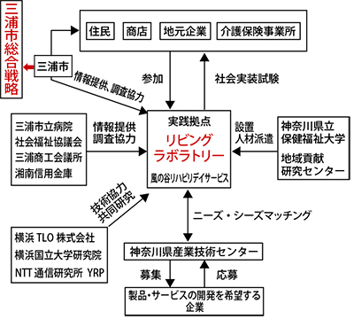 三浦市の高齢化率は約33%と県内で最も高い。少子化と若年層の他都市への流出に歯止めがかからず、市内人口の3人に1人が65歳以上の高齢者が占める”超高齢化社会”が進んでいる。プロジェクトでは、三浦市の現状を「近い将来の地方都市や日本の姿を先取りした地域」と位置付け、今後も成長が期待されるシルバー産業の育成を行うリサーチタウンとしての整備を提案。企業の製品開発に利用者の声を反映させて利便性を向上させる「リビングラボ」と呼ばれる手法を採用し、岬陽町の「風の谷リハビリデイサービス」を拠点に8団体が人材派遣、技術・情報協力、資金提供、ニーズ調査など相互協力を図る。リビングラボではすでに介護・リハビリ用ロボットの開発や健康づくり教室がスタートしており、その他にもICT(情報・通信技術)を活用した食生活改善・健康維持のための買い物支援、独居高齢者の見守りと転倒予防に関する取組みを進めていく考え。
