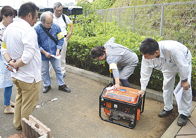 訓練は震度6強、南関東地震の発生を想定。参加者らは避難所の設営や被災者の受け入れ手続きをはじめ、小型発電機を使った非常時電力の確保、防火水槽水の利用、119番への通報などを体験した。