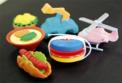 消しゴムは全50種類。消防車やヘリコプター、ケーキやラーメン、ボールやバットなど見た目にも楽しいものばかり。「手にとった子どもに面白いと思ってもらえれば」と伊東さん。購入費は1個30円で今後10万個を目指し、チャリティーイベントを通じて購入費を募っていくという。