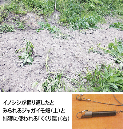 その後、同町内会が町にイノシシの捕獲許可を申請。実際の捕獲にあたっては認可証を持つ専門家の協力をあおいだ。使ったのはイノシシが足を踏み入れるとバネでワイヤーが締まる「くくり罠」。被害のあった農地など9カ所に設置したところ、8日に体長およそ60cmほどの若い雄イノシシが捕獲されているのが確認された。ただ、一部で「複数頭のイノシシを見た」という目撃情報もあるため、今後も1年間をめどに罠による捕獲を続ける。農作物被害に遭った石井義房さんは「丹精込めて作った農作物を荒されるのは農家として忍びない。早く解決してほしい」と話した。