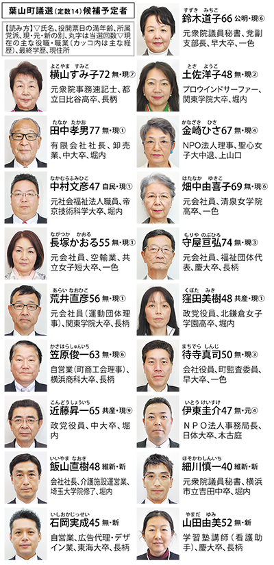 任期満了に伴う葉山町議選(定数14)が4月21日の告示(26日投開票)まで残り1カ月を切った。3月25日現在で定数を5上回る19人が立候補を表明しており、22人が出馬した2011年に続き、混戦が予想される。