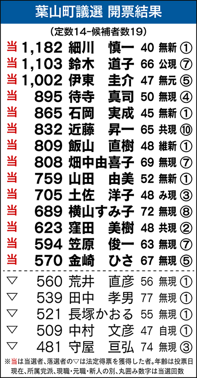 任期満了に伴う葉山町議選(定数14)が先月26日に投開票され、新たな町議の顔ぶれが決まった。今回の町議選では、定数を5上回る19人が立候補。投票率は前回53・61%を0・91ポイント下回る52・70%で微減した。