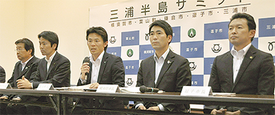 横須賀、鎌倉、逗子、三浦の4市と葉山町の5首長が共通の課題や活性化策などについて話し合う「三浦半島サミット」の4回目の会合が21日、葉山町福祉文化会館で開かれた。県が推進する「未病」への取り組みなど2事業について連携を強化することを確認したほか、新たに県自転車商協同組合と協定を締結。松尾崇鎌倉市長から、歴史的建造物などを活用した「居住体験・滞在プログラム」の提案もあった。