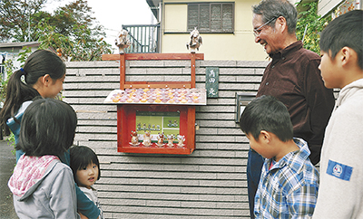 自宅の玄関先に据えられたショーケース。「掲示板」と名付けられたここには土曜日になると「今週のニューフェイス」が登場する。お祭りでたこ焼きを作るカエル、射的やボルダリングに興じるウサギ、本物顔負けのカブトガニやクワガタ。ストーリー性溢れるものからリアルなものまで。素材は貝だけ、それも「割らない・塗らない・削らない」をモットーとしてるとは一見信じられないほど、その表情は豊かだ。作品は近所でも評判で、散歩の途中に訪れる人や子どもたちが登下校の間に足を止めたり。近所に住む小学4年生の男の子は「いつも新作が出るのが楽しみ。見ていると嬉しい気持ちになる」と話す。