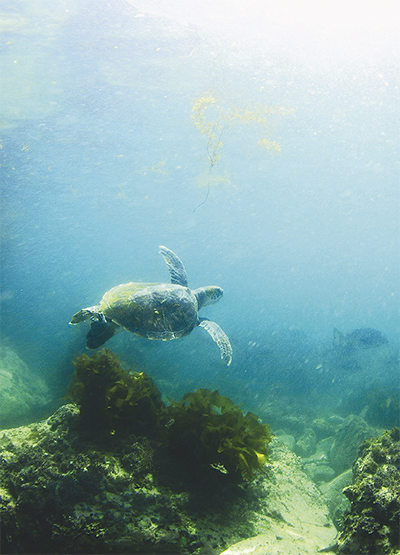 葉山町の芝崎海岸沖でアオウミガメが目撃された。一色の「ダイビングショップナナ」のスタッフ、永橋麗良さん(24)が19日、発見し撮影。葉山の沿岸でアオウミガメが目撃されるケースは珍しいという。