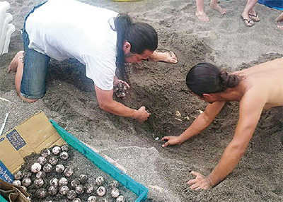 同海水浴場で運営する「ブルームーン」代表の近藤賢作さん(44)が午後10時頃、常連客からの知らせで波打ち際から40mほど離れた砂浜で、体長1mほどのウミガメを発見。産卵場所を探していたとみられ、2度目に掘った穴に卵を産み落とした。産卵巣はその日のうちに杭とロープで保護。だが、人通りが多い場所で卵が潰されてしまう可能性があったため、翌朝、江ノ島水族館飼育係のアドバイスを得て、約20m離れた店のそばに移植。深さ約50cmの巣からはピンポン玉大の卵60個が見つかった。近藤さんはまだ殻の柔らかい卵が壊れないよう、スタッフと丁寧に埋め直した。