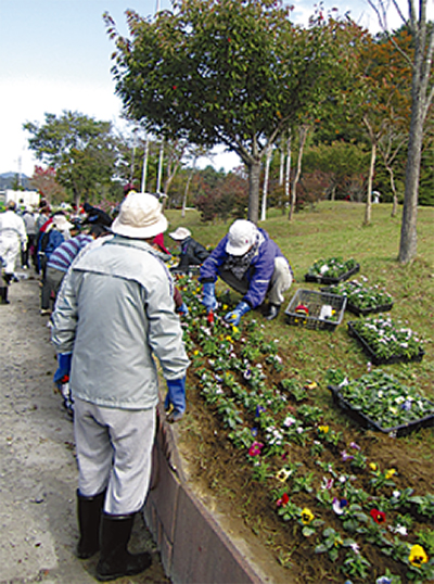当日は、同会、JICA、仮設入居者計80人が参加。中心となって活動する鈴木恒夫さんは「被災地で役に立つことをしたいという人が集まってくれた。住民と一緒に花を植えられて有意義な時間だった。早く元気になってほしい」と感想を話した。