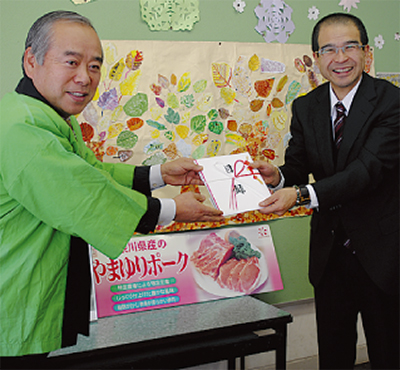 やまゆりポーク生産者協議会(西山國正会長)は先月25日、鵠沼小学校(山本正良校長)に「やまゆりポーク」約34kgを寄贈した。豚肉は約800食分のプルコギに調理され、当日の給食のメニューとして児童らに振る舞われた。