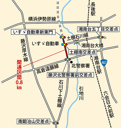 石川下土棚線は、石川三丁目地内の「南鍛冶山交差点」で主要地方道藤沢厚木線から分岐し北上、都市計画道路高倉遠藤線との「藤沢北警察署前交差点」でT字型に交差、接続していた。今回の部分供用で、都市計画道路土棚石川線と接続できたことにより、「湘南台大橋」を経由し、国道467号線の「湘南台五丁目交差点」との連絡が可能となった。