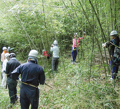 明治地区森林ボランティアによる竹の伐採が22日、神奈川県立21世紀の森(南足柄市)で行われた。当日は明治中、羽鳥中の生徒や羽鳥小、八松小の児童、引率の大人など24人が参加、精力的に汗を流した。