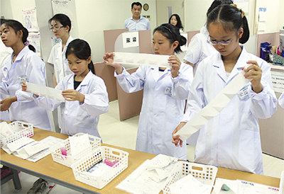 藤沢市薬剤師会(後藤知良会長)による「子ども調剤体験教室」が8月6日、同会会営薬局で行われた。当日は小学6年生と保護者、10組が参加した。