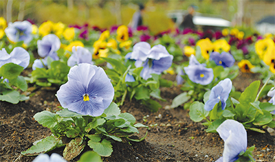 このパンジーは、職業体験に来た中学生と、同園草花栽培ボランティア、子どもサポーターらの協力によって、今年11月に植えられたもの。モニュメント下の花壇は、職業体験に来た中学生らがデザインしたという。
