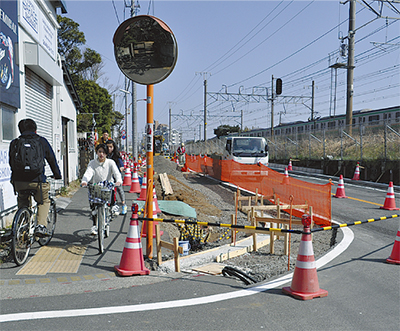 湘南モールフィル前の東海道線沿いの市道「藤沢駅辻堂駅線」で、歩道拡幅工事が進められており、3月下旬をめどに自転車専用レーンが延伸する。