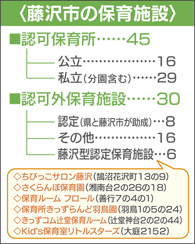 待機児童の緊急対策として、市は今年度中に3園の認可保育所を新設し、定員230人の拡大を目指す。今月、辻堂駅前に1保育所が開所したほか、現在、藤沢駅前に2保育所の開設が進められている。