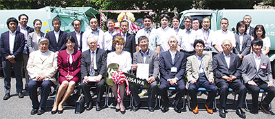 藤沢市役所本館前で5月14日、ブータン王国への塵芥(じんかい)収集車贈呈式が行われた。式には、鈴木恒夫藤沢市長や同王国名誉総領事の徳田ひとみさん、(社)日本外交協会理事長の池浦泰宏さんのほか、藤沢市議会議員らが出席した。