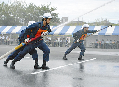 同大会は、消防団員の消防操法技術の向上と、士気の高揚を図るために毎年開催されているもの。災害時の地域防災のため活動する市内31カ所の消防分団員たちが、一堂に会して訓練で磨いた技術を競い合う。市消防局によると、種目の「小型ポンプ操法」は、東日本大震災のような大災害発生時に、道路が塞がれて消防車が進入できない現場などでも、消火活動を行える手段だという。