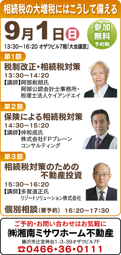 相続税対策セミナー「相続税の大増税にはこうして備える」が9月1日(日)、辻堂駅前のオザワビル7階で開かれる。時間は午後1時30分から4時20分まで。定員50人で申込先着順。