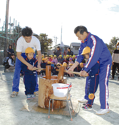 園児らは冬の寒空の下、元気いっぱいに園庭に集合。大人たちの指導や補助を受けながら杵を手にし、「よいしょ、よいしょ」の掛け声とともに次々と餅をついていった。