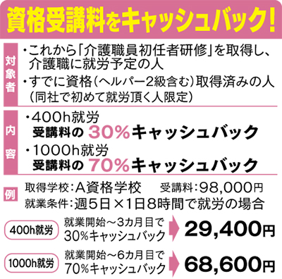対象は「介護職員初任者研修」の修了者で、同社の登録スタッフとして初めて就労する人。また、すでに取得済みの人も取得学校や時期を問わず、全額受講料が戻ってくる。
