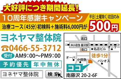 地域に愛され開院10周年を迎えた南藤沢の「ヨネヤマ整体院」。バキッ、ボキッという整体ではなく、身体を気持ちよく動かしながら骨格のズレや歪みを正しい位置に戻す「操体法」などを取り入れ、4万回以上の施術実績を誇っている。