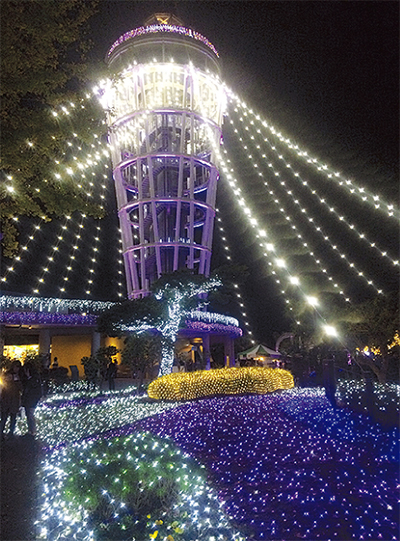 関東三大イルミネーション認定の「湘南の宝石〜江の島を彩る光と色の祭典〜」のライトアップが11月29日から始まった。サムエル・コッキング苑には今年も「光のトンネル」が登場し、4万個のクリスタルビーズがきらめく中、記念撮影をするカップルや観光客で賑わっている。