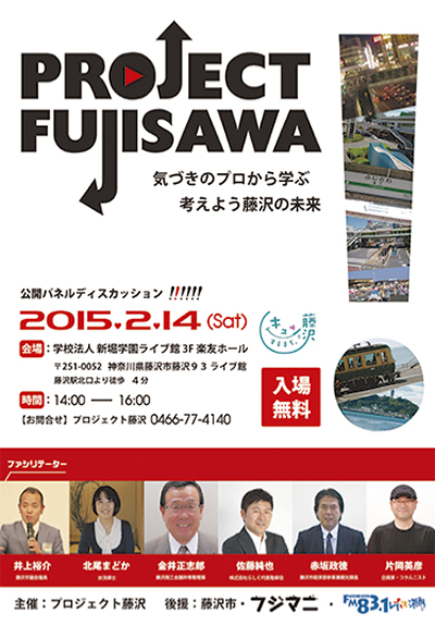 地元の有志者が立ち上げた「プロジェクト藤沢」が主催する公開パネルディスカッションが2月14日(土)に新堀学園ライブ館3階楽友ホール(藤沢駅北口徒歩4分)で行われる。時間は午後2時から4時。入場無料。