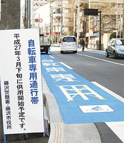 これまで市内の自転車道整備は、藤沢駅辻堂駅線など「普通自転車通行指定部分」として歩道(自転車歩行者道)の一部を活用する形態が中心だった。2012年に国土交通省などが定めたガイドラインで、自転車の通行を車道の左側とする基本ルールが推進されたことを受け、市でも14年「ふじさわサイクルプラン」を策定。道路幅や交通量などをもとに自転車レーンの設置を進めてきた。