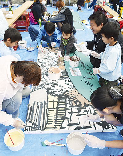 同会議所メンバー4人が2日間かけて下絵を描き、準備。当日は約20パーツに分けて、参加者が完成図を見ながら水性ペンキで丁寧に色付けすると、遊行寺から見た江の島詣をする人々の様子が浮かび上がった。