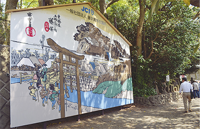 白旗神社(鈴木大次宮司)境内に4月24日から、歌川広重の木版画「東海道五十三次」に登場する藤沢宿を描いた横7・2m、縦5・1mの巨大な手作り絵馬が飾られている。