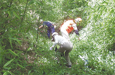 明治地区青少年ふれあいネットワークの事業「森林ボランティア」が8月9日、神奈川県立21世紀の森(南足柄市)で行われた。当日は、羽鳥中学校の生徒や付添いの保護者、引率の大人など24人が参加。夏の日差しに汗を流しながら、施設内の森に悪影響を与える竹を伐採した。