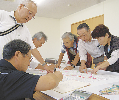 取材を行った9月28日は、6人の参加者がアイデアを出し合っていた。古地図と現在の地図を見比べ「線路は田んぼがあるところに敷かれている」「町の中心地が、駅と国道沿いに移動している」「道の数が増えている」など、さまざまな発見を、中学生が見ても分かるようにまとめるという。「先輩の話を聞いてみると住んでいても知らない事ばかり、知識を身に付けることで地元が好きになっていく」と笑顔で話した。
