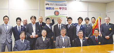 兵庫県の阪神甲子園球場で11月7日(土)と8日(日)に開かれる「マスターズ甲子園2015」に神奈川県代表として初出場する藤嶺学園藤沢高校野球部OBチーム(山田光雄監督)のメンバーが10月23日、藤沢市役所を訪れ、鈴木恒夫市長に出場報告を行った。