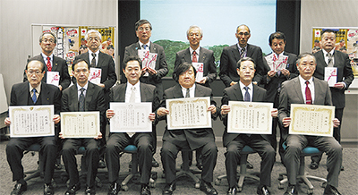 藤沢市役所防災センターで2月22日、神奈川県遊技場協同組合(伊坂重憲理事長)と神奈川福祉事業協会(同会長)、藤沢、大和・綾瀬、座間・海老名の遊技場組合が、秋葉台文化体育館で4月9日(土)に開催される「第24回大相撲藤沢場所」(勧進元・最上重夫氏)の招待券264枚を6市1町に寄贈した。