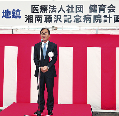 その後、竹川理事長は「この日を待ち望んでいた。事故が無いよう、建設工事が滞りなく進むことを祈念する」とあいさつ。鈴木藤沢医師会会長は、「市がこの遠藤地区で進める『健康と文化の森地区まちづくり』は、自分が子どものころからあった構想なので、こうして関われることは感慨深い。新たな街づくりや、高齢化が進む市西北部の医療拠点としても期待される」と語った。