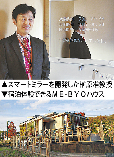 慶大の実証実験用施設を活用した未病ハウスには、各メーカーの血圧計や体重・体組成計、寝返りを計測する機器などを設置。宿泊期間中、居住者は普段通り食事や団らん、外出、入浴、睡眠を行いながら、各種機器での計測を行う。朝晩の血圧・体重計測のほか、活動量計の装着、排便時の二酸化炭素量を計測するトイレの利用、睡眠時の心拍や呼吸、寝返り回数を測るベッドで身体データを総合的に管理することで、未病の兆しを可視化できるのかを検証するという。洗面台の鏡「スマートミラー」には数値のほか、「血圧が高めです。食事に気を付けましょう」などシステムによるアドバイスが表示される。