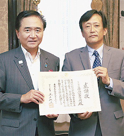 神奈川県と協働で水源林の保全活動に取り組んでいる(株)荏原製作所は9月21日、県から感謝状が授与された。県庁で行われた贈呈式には、藤沢事業所長の白樫充彦さんが参加し、黒岩祐治県知事から感謝状を受け取った。