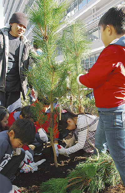 当日は100人以上の児童が参加。同会議所メンバーの手も借り、15本の苗木を敷地北側に植えた。